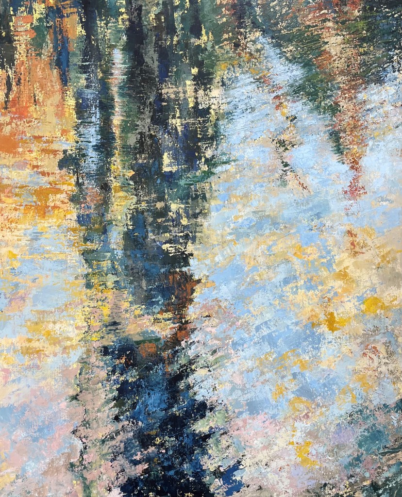 « Ombres Vibrantes » capture les reflets d’arbres dans l’eau avec des couleurs automnales . L’eau vibrante crée des ondulations joyeuses, ajoutant du dynamisme à l’ensemble. Cette œuvre célèbre la beauté naturelle et le mouvement constant de la vie.